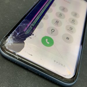 さて、皆様もうお気づきかと思いますがiPhoneXRの画面がバキバキに割れて尚且つ下地の液晶まで故障してしまっていますね・・・((((;゚Д゚)))))))