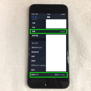 内部状態も見ていきましょう。購入されたのがAppleStoreと言うこともあり、SIMロックがかかっていません。これは買取額がUPする要因の一つです。お持ち込みになる前にぜひ解除しましょう!キャリアさんの公式サポートサイトなどでも解除できますし、手数料がかかってしまいますが、キャリアショップでも解除をしています。容量は32GBで若干少ないかなと思いもしますが、電話・LINEやSNS、YouTubeを見る程度であれば問題ないと言えるでしょう。