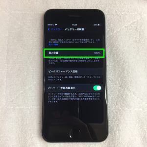 バッテリーの状態は100%でした。1ヶ月ほど前にバッテリー交換をしたそうで、バッテリーは申し分のない状態です!バッテリーは90%を下回っている状態だと、劣化が進んでおり、1日持たなくなってくる基準にもなりますので、バッテリーの最大容量が90%を下回った場合は若干減額になってしまいます。