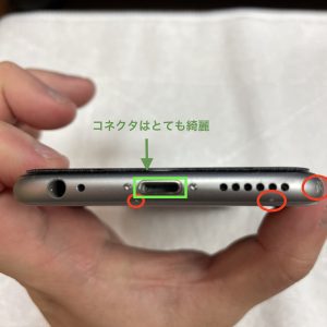 本体下には細かい傷と右側に擦ってしまったような目立つ傷があります。落としてしまった時についてしまったものだと思われます。Lightningコネクタの内部はとても綺麗で、無理な力が加わった跡や感触がなく、非常に良好な状態でした。